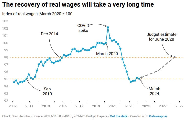 That news generated a few headlines. The most pessimistic of the bunch was from The Guardian’s Greg Jericho, who noted the fact that real wages have gone so far backwards that they’re now equivalent to 2010 levels: