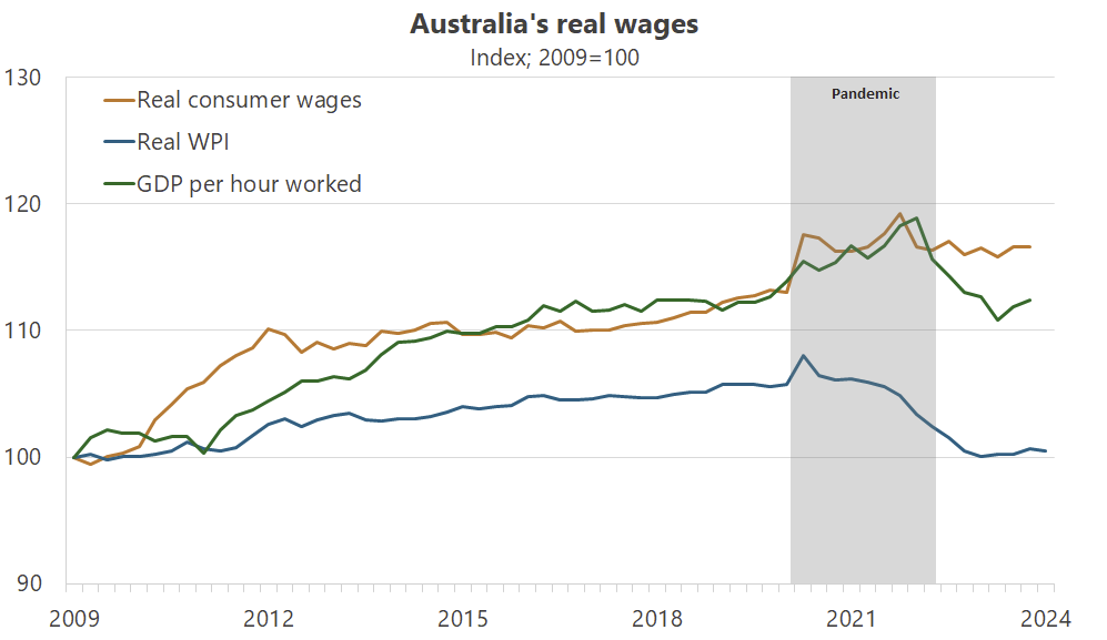 So, the stagnation of real consumer wages in recent years, and falls in the WPI/CPI real wage, is best thought of as part of the adjustment process to the pandemic and mining boom the global response to it kicked off. When labour productivity catches back up, we should start to see real wage growth again.
