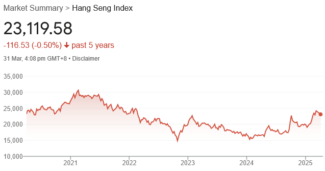 But it has still been a rough few years for the Chinese entrepôt. Its local stock market, the Hang Seng Index, has seen zero nominal returns over the past five years (for context, the ASX200 has grown by 55% over the same period):