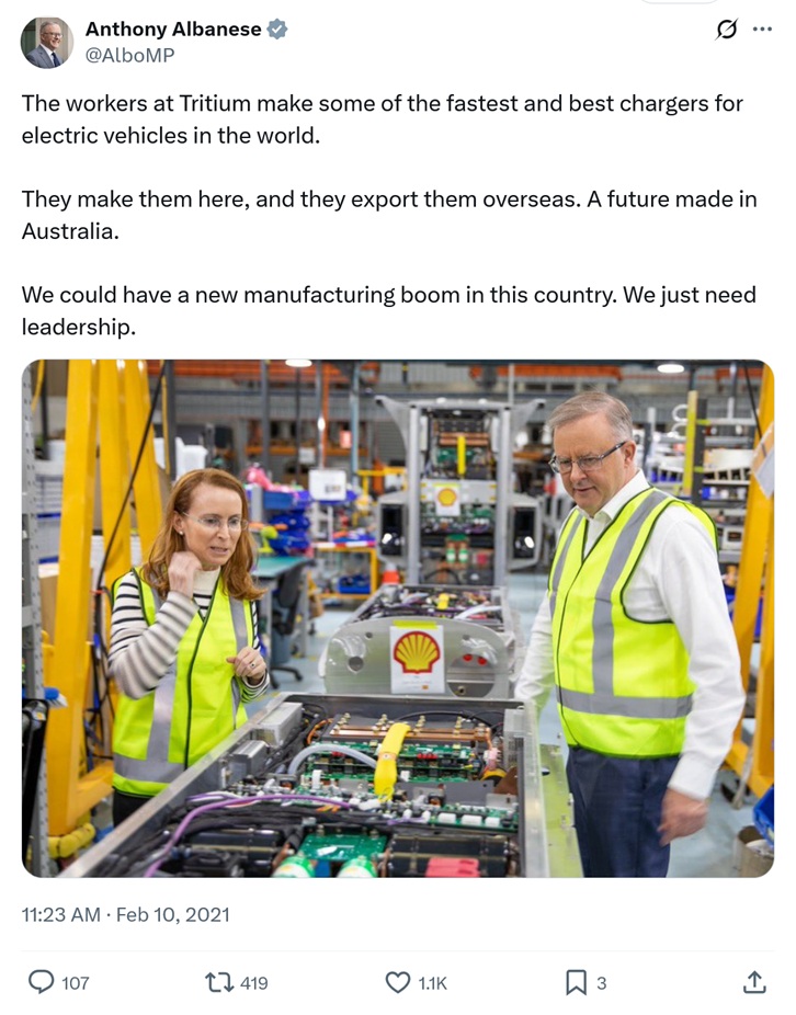For reference, Tritium took the money and ran to the US, only to enter insolvency and eventually get bought by Indian manufacturer Exicom. Its electric vehicle chargers were so bad that local governments are now ripping them out rather than try to constantly repair them.