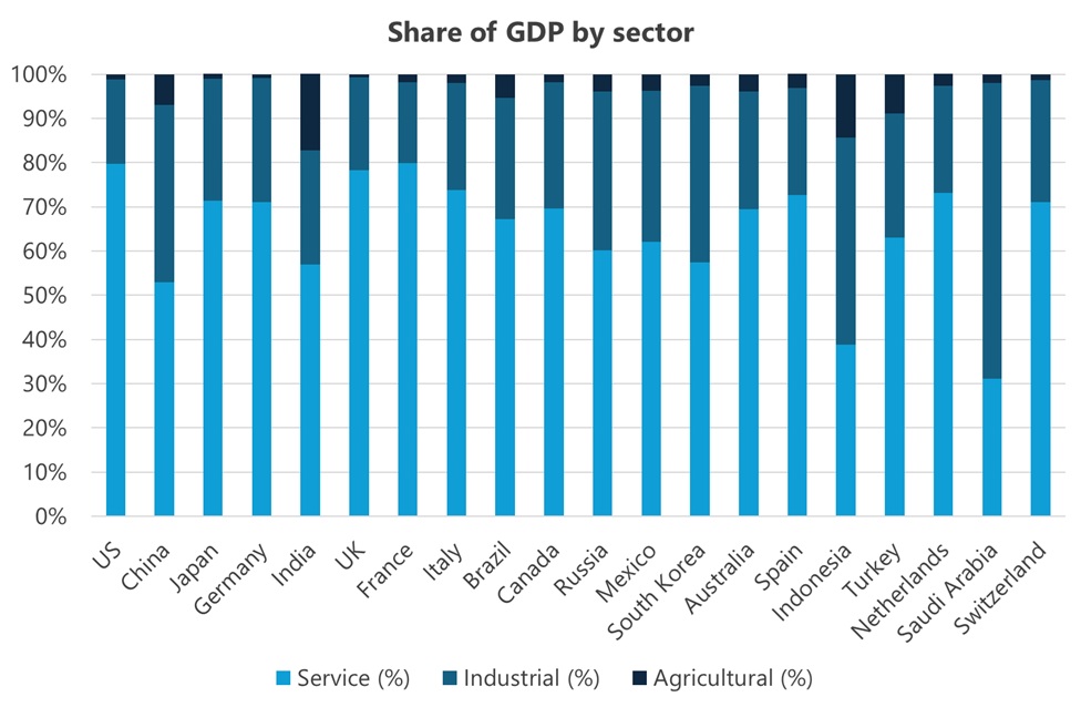 The other sector that has grown in relative size is services, which now makes up around 70% of the Australian economy—and much more than that in terms of employment. For context, Australia’s services share is actually below the levels seen in most similarly-wealthy nations. Indeed, “industry” as a share of the Australian economy is in-line with Japan and Germany, and well ahead of the US and UK: