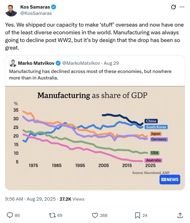 If there’s one line I read on social media more than anything—other than “immigrants bad!”, of course—it’s that Australia doesn’t make ‘stuff’ anymore. For example, on Friday pollster Kos Samaras tweeted the following: