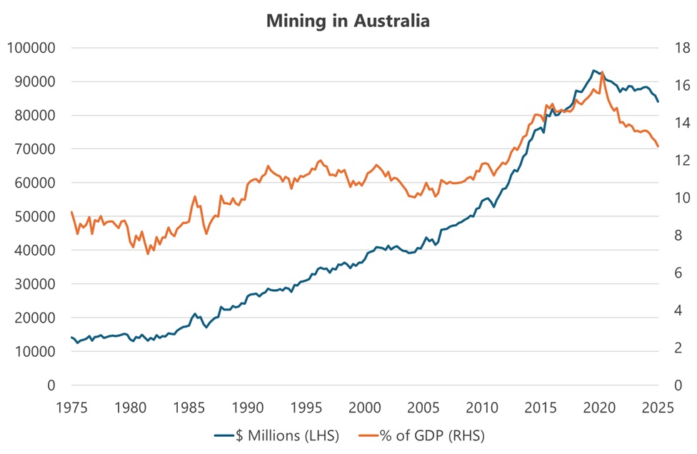 There has been no ‘hollowing out’ of Australia’s industrial base. It’s just that instead of continuing to expand the manufacturing sector, Australians have allocated resources where the returns are greater. One of those sectors is mining, whose share of GDP has gone from around 8% in the 1970s to 13% today—filling a good part of the share of GDP that manufacturing vacated: